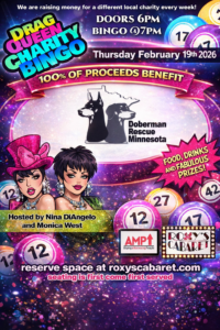 Doberman Rescue Minnesota is thrilled to be the featured charity for Drag Queen Charity Bingo at Roxy’s Cabaret in Mpls, MN on Thursday, February 19th, 2026!