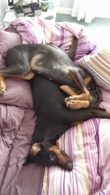 Atlas here with another adorable picture of my best dober bud Revo and me! This is how we take our morning nap! Revo is a great pillow! It’s such a rough life . . .