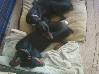 We have been receiving many calls for surrenders lately and just this past Sunday took in 5 homeless dobermans, 3 males and 2 females. One other male was deferred to Wisconsin Rescue, DRAW. The two boys here are Apollo and Magnum, one year male old siblings who will be available for adoption after they have been carefully evaluated by the vet and our foster family. Check back for updates on all the dobes we just took in.