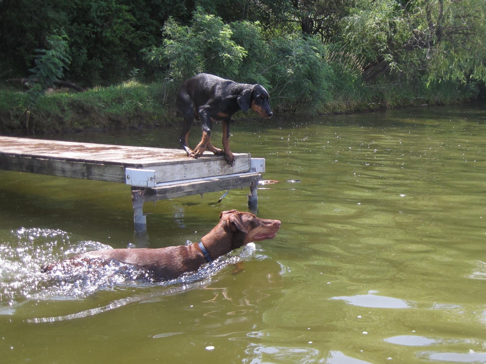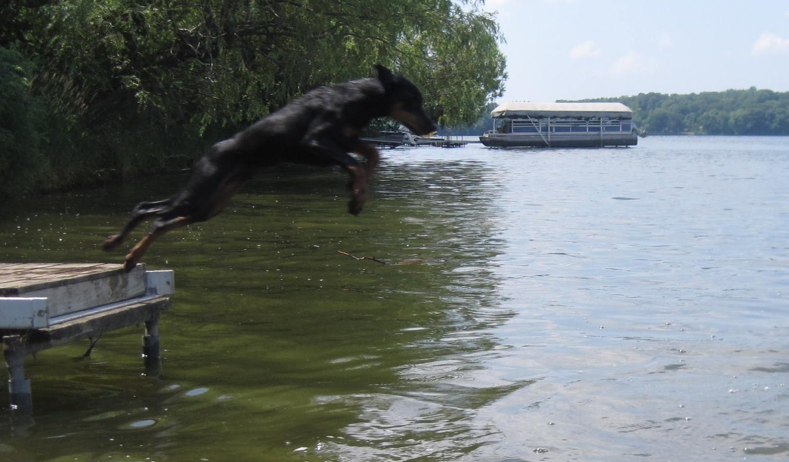 | Hey Ti, watch me do a Doberman cannon ball! |