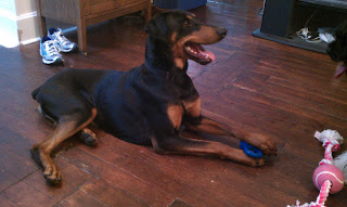 Oberon “Obe” (the name means “noble bear” in German). It’s non-stop play around the house. He’s really settling nicely. We haven’t had any accidents in the house. He potties outside very nicely. He kennels nicely and made it through the night in his kennel without a single complaint. All in all, he’s a great dog. The only issue we have from time to time is barking as he does not like to be left alone and will make it known to the entire neighborhood. However, I think once he settles and feels more secure that will go away. Oberon is a 1 year old, neutered male dobe. Oberon and his brother Dakota, with 2 other littermates, were surrendered to a shelter and found the way to DRM. These pups have had no proper socialization or obedience and are starving for human affection and attention. The world will be less scary with a trusting human to guide them along. Both these young dobe boys will be great dogs someday. Watch for Obe’s brother, Dakota, coming soon. Dakota is a little camera shy!