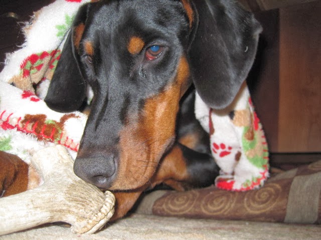 Straight from the North Pole! Baby Mordy here! The Rescue Elves stuck again! Grrr-ruff and GRRRR-whoohoo! I feel the love, from my little clickity toenails, to my stubby tail and floppy ears, and back, right to my heart!!! Santa’s rescue elves sent grr-oodles of wonderful canine mmmm-morsels, humongous, ginormous horns and antlers to entertain all us homeless dobes chompers, fuzzy, suckable blankies to keep us warm and so many other things that make all of us rescue dobes feel SOOO loved. For little ole me, its the next best thing to having my fur-ever family, grrr-wooof! “Hey rescue elves, if you could hurry up and find me a nice fur-family for Christmas, that I could adopt, please send them to me, via Priority First Class SANTA Express. I’m gonna wait right here and chew on this MMMMM-nummy antler! Grr-woof and thank-you, my little rescue elves! I’m sending a big, sloppy, antler infused, wet one your way!” Love Mordy, mmmm-this is really de-lish!